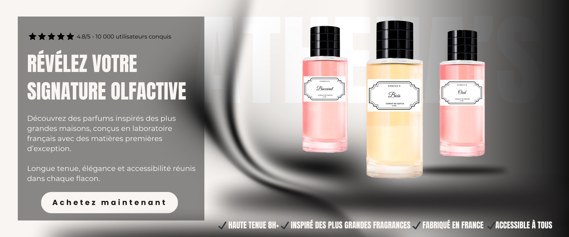 Découvrez l'essence de l'élégance avec Athena's . Nos parfums de luxe captivants à prix irrésistibles vous invitent à vous démarquer.